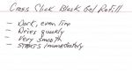 Cross calls this a gel ink pen. The initial cartridge in the pen is a medium black, (I have not found any marks indicating tip size on the refills.). Writing quality is smooth, and the refill writes a consistent, solid black line, with no blobs or skips seen early in its use. The ink dries on the paper in about 3-5 seconds. It was too early to determine if the refill dries out overnight. My opinion is that the black Cross refill writes very well, in the same league as any of the others I use, including Uniball, Pilot, and Pentel.