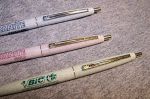Here are a few advertising specialty BIC Clic BPs I picked up along the way. The Clic was a serious (? - my opinion) challenger to Papermate BPs when they came out. They were pretty cheap compared to a Papermate Malibu or Parker Jotter, and somewhat attractive. The Clic had two main flaws: 1) The BIC refills were unpleasant to use, with thick, hard flowing ink that usually left an uneven line and blobs on your homework assignments. 2) The tip of the pen where the point exited the barrel was fragile plastic, and the writer usually ended up with a broken tip that left the refill point exposed and looked foolish.