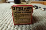 We have a Vintage Speedry Brushpen set out of grandma's estate, trying to get more history on it and possibly a value, includes the pen, eyedropper, box and mostly dried up bottle of ink, the nibs (49) pictured do not fit this pen and they appear not to have been used, although I didn't go thru all of them. I think it is from the late 40's or early 50's, haven't been able to find out much about it. Any help would be appreciated. The box is in pretty good shape for it's age, the eyedropper looks like it is glass and leather or man made and is cracking.